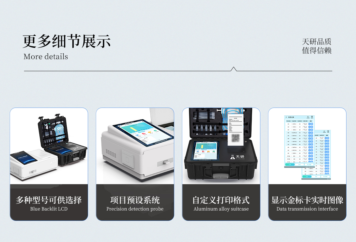 | 儀器采用手提一體化系統(tǒng)檢測技術(shù),將分光光度模塊、膠體金檢測模塊、新型農(nóng)殘檢測模塊、數(shù)字化管理模塊、無線通訊模塊高度集成于一體,支持檢測200種食品安全檢測項(xiàng)目,同時預(yù)留升級檢測方法。 | 儀器檢測模塊標(biāo)準(zhǔn)化、智能化,檢測項(xiàng)目可隨意自由組合。檢測箱體內(nèi)置多個標(biāo)準(zhǔn)檢測單元,檢測模塊可以調(diào)整配置。 | 顯示屏幕:儀器采用10.1英寸豎向液晶觸摸屏顯,搭配運(yùn)行安卓智能操作系統(tǒng),主控芯片采用ARM Cortex-A7,RK3288/4核處理器,主頻1.88Ghz,操作方便,性能更強(qiáng)。 | 檢測通道:≥12通道;采用精密旋轉(zhuǎn)比色池設(shè)計(jì),使用同芯片同光源校準(zhǔn)精度,解決不同光源之間的誤差值,更加準(zhǔn)確**。(1-12通道間誤差0.1%,**號:ZL202022821055.2) | 儀器光源:高精度進(jìn)口四波長冷光源,每個通道均配置 410、520、590、630nm 波長光源,標(biāo)配**的光路切換裝置,**光路切換功能可實(shí)現(xiàn)64波長,并且所有檢測項(xiàng)目可實(shí)現(xiàn)所有通道同時檢測。 | 設(shè)備可一鍵校準(zhǔn),自動保存校準(zhǔn)數(shù)據(jù),自動對比校驗(yàn),得到精準(zhǔn)光源,采用Android SP存儲數(shù)據(jù),光源數(shù)據(jù)永不丟失,方便每一次使用。 | 通訊接口:配備無線通信模塊、4G(APN)通訊模塊、藍(lán)牙傳輸,同時具有雙USB接口以及RJ45網(wǎng)線接口,可以多方式實(shí)現(xiàn)數(shù)據(jù)保存及數(shù)據(jù)傳輸。 | 存儲方式:支持U盤存儲,標(biāo)準(zhǔn)USB接口,免驅(qū)動安裝。檢測結(jié)果存儲容量20萬條以上,可生成Excel表格進(jìn)行拷貝,并具有登錄保護(hù)功能。 | 智能化操作系統(tǒng):: ★操作系統(tǒng):儀器可在同一檢測界面自動對應(yīng)相關(guān)檢測通道,一次性選擇1-12個樣品名稱,無需退出界面,節(jié)省操作時間。并可以對每個通道屬性和樣品信息單獨(dú)進(jìn)行編輯,例如送檢單位、人員,檢測人員等,打印時勾選打印顯示。 | ★數(shù)據(jù)集成系統(tǒng):設(shè)備首頁自動匯總分析檢測數(shù)據(jù),包含:周檢測數(shù)據(jù)、月檢測數(shù)據(jù),全部檢測總數(shù)量,均包含檢測總數(shù),合格數(shù),不合格數(shù),以及相關(guān)柱形分析圖,各項(xiàng)檢測數(shù)據(jù)一目了然,無需電腦查詢,更加快捷直觀。 | ★數(shù)據(jù)庫系統(tǒng):十幾項(xiàng)數(shù)據(jù)庫分類管理儀器:包含項(xiàng)目類型、項(xiàng)目數(shù)據(jù)、檢測數(shù)據(jù)、歷史記錄、國標(biāo)信息、曲線信息、采樣信息、檢測信息、受檢信息、復(fù)核信息、圖表信息、光源校準(zhǔn)信息、打印樣式信息、樣品庫信息等等,數(shù)據(jù)庫之間互相協(xié)調(diào)聯(lián)動保證數(shù)據(jù)的真實(shí)完整性。同時產(chǎn)品數(shù)據(jù)庫以及歷史檢測記錄支持一鍵檢索功能。 | ★限量規(guī)判系統(tǒng):具有限量查詢、添加物質(zhì)合規(guī)判定系統(tǒng)。檢測出結(jié)果后,系統(tǒng)自動調(diào)用系統(tǒng)數(shù)據(jù)庫中相關(guān)國標(biāo)進(jìn)行比對判定,客觀顯示判定結(jié)果是否合格 | ★項(xiàng)目預(yù)設(shè)系統(tǒng):儀器具有任務(wù)預(yù)設(shè)模塊,一鍵提前預(yù)設(shè),給出方便快捷的新檢測方案,每一個任務(wù)分別可以設(shè)置不同的樣品、批次、編號、來源、備注、抽樣信息、檢測信息、受檢信息、復(fù)核信息等更多信息。樣品送檢時一鍵調(diào)取保存信息,并可多次調(diào)取,大大提高檢測效率。 | ★數(shù)據(jù)監(jiān)管系統(tǒng):同步對接監(jiān)管平臺,數(shù)據(jù)可局域網(wǎng)和互聯(lián)網(wǎng)數(shù)據(jù)上傳,檢測結(jié)果可選擇直接傳至食品安全監(jiān)管平臺。進(jìn)行區(qū)域食品安全監(jiān)管及大數(shù)據(jù)分析處理與數(shù)據(jù)統(tǒng)計(jì),檢測區(qū)域食品安全長短期動態(tài),達(dá)到食品安全問題預(yù)估、預(yù)警。 | ★打印系統(tǒng):內(nèi)置全新打印機(jī),新創(chuàng)自定義打印方式,可按需靈活勾選控制:產(chǎn)品合格證(國家農(nóng)業(yè)部標(biāo)準(zhǔn)要求),二維碼,抽樣信息、檢測信息,受檢信息、復(fù)核信息、抽樣日期、檢測日期等信息的打印。 | 供電模式:儀器交直流兩用,直流12V供電,可連接車載電源,可配6ah大容量充電鋰電池,電量可實(shí)時顯示,方便戶外流動測試。 | 膠體金檢測模塊:采用雙通道CMOS成像處理技術(shù)及膠體金免疫層析技術(shù),可同時讀取雙膠體金卡數(shù)據(jù),自動采集、處理分析,將檢測結(jié)果顯示,并可根據(jù)參考限值自動判斷檢測結(jié)果,可檢測常見的獸藥殘留、生物毒素、抗生素、違禁添加物等。 | ★探測技術(shù):CMOS成像探測; | ★檢測通道:1個通道; | ★檢測方式:消線法和比色法; | ★顯示模式:陰性或陽性; | 曲線形式:軌道式掃描方式,顯示金標(biāo)卡圖像,實(shí)時生成、識別CT曲線圖,無需手動調(diào)整,完成檢測后自動退出檢測卡。兼容市場上其他金標(biāo)卡,使用耗材不受限制。 | 儀器具備遠(yuǎn)程升級功能,可定向分客戶分儀器更新,開機(jī)后自動更新,并可持續(xù)性免費(fèi)更新系統(tǒng)版本,無需像傳統(tǒng)產(chǎn)品返廠更新,節(jié)省時間及人力成本并避免了物流運(yùn)輸返廠升級導(dǎo)致設(shè)備損壞的潛在風(fēn