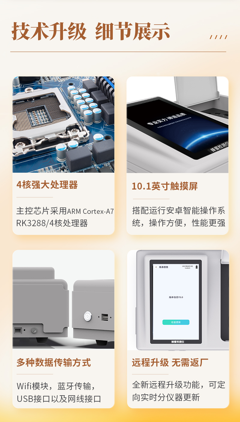 | 儀器采用臺(tái)式一體化系統(tǒng)檢測(cè)技術(shù),將分光光度模塊、數(shù)字化管理模塊、無(wú)線通訊模塊高度集成于一體,支持檢測(cè)200種食品安全檢測(cè)項(xiàng)目,同時(shí)預(yù)留升級(jí)檢測(cè)方法。 | 儀器檢測(cè)模塊標(biāo)準(zhǔn)化、智能化,檢測(cè)項(xiàng)目可隨意自由組合。檢測(cè)箱體內(nèi)置多個(gè)標(biāo)準(zhǔn)檢測(cè)單元,檢測(cè)模塊可以調(diào)整配置。 | 顯示屏幕:儀器采用10.1英寸豎向液晶觸摸屏顯,搭配運(yùn)行安卓智能操作系統(tǒng),主控芯片采用ARM Cortex-A7,RK3288/4核處理器,主頻1.88Ghz,操作方便,性能更強(qiáng)。 | 檢測(cè)通道:≥12通道;采用精密旋轉(zhuǎn)比色池設(shè)計(jì),使用同芯片同光源校準(zhǔn)精度,解決不同光源之間的誤差值,更加準(zhǔn)確**。(1-12通道間誤差0.1%,**號(hào):ZL202022821055.2) | 儀器光源:高精度進(jìn)口四波長(zhǎng)冷光源,每個(gè)通道均配置 410、520、590、630nm 波長(zhǎng)光源,標(biāo)配**的光路切換裝置,**光路切換功能可實(shí)現(xiàn)64波長(zhǎng),并且所有檢測(cè)項(xiàng)目可實(shí)現(xiàn)所有通道同時(shí)檢測(cè)。 | 設(shè)備可一鍵校準(zhǔn),自動(dòng)保存校準(zhǔn)數(shù)據(jù),自動(dòng)對(duì)比校驗(yàn),得到精準(zhǔn)光源,采用Android SP存儲(chǔ)數(shù)據(jù),光源數(shù)據(jù)永不丟失,方便每一次使用。 | 通訊接口:配備無(wú)線通信模塊、可選配4G(APN)通訊模塊和藍(lán)牙傳輸,同時(shí)具有雙USB接口以及RJ45網(wǎng)線接口,可以多方式實(shí)現(xiàn)數(shù)據(jù)保存及數(shù)據(jù)傳輸。 | 存儲(chǔ)方式:支持U盤存儲(chǔ),標(biāo)準(zhǔn)USB接口,免驅(qū)動(dòng)安裝。檢測(cè)結(jié)果存儲(chǔ)容量20萬(wàn)條以上,可生成Excel表格進(jìn)行拷貝,并具有登錄保護(hù)功能。 | 智能化操作系統(tǒng): | 1)操作系統(tǒng):儀器可在同一檢測(cè)界面自動(dòng)對(duì)應(yīng)相關(guān)檢測(cè)通道,一次性選擇1-12個(gè)樣品名稱,無(wú)需退出界面,節(jié)省操作時(shí)間。并可以對(duì)每個(gè)通道屬性和樣品信息單獨(dú)進(jìn)行編輯,例如送檢單位、人員,檢測(cè)人員等,打印時(shí)勾選打印顯示。 | 2)數(shù)據(jù)集成系統(tǒng):設(shè)備首頁(yè)自動(dòng)匯總分析檢測(cè)數(shù)據(jù),包含:周檢測(cè)數(shù)據(jù)、月檢測(cè)數(shù)據(jù),全部檢測(cè)總數(shù)量,均包含檢測(cè)總數(shù),合格數(shù),不合格數(shù),以及相關(guān)柱形分析圖,各項(xiàng)檢測(cè)數(shù)據(jù)一目了然,無(wú)需電腦查詢,更加快捷直觀。 | 3)數(shù)據(jù)庫(kù)系統(tǒng):十幾項(xiàng)數(shù)據(jù)庫(kù)分類管理儀器:包含項(xiàng)目類型、項(xiàng)目數(shù)據(jù)、檢測(cè)數(shù)據(jù)、歷史記錄、國(guó)標(biāo)信息、曲線信息、采樣信息、檢測(cè)信息、受檢信息、復(fù)核信息、圖表信息、光源校準(zhǔn)信息、打印樣式信息、樣品庫(kù)信息等等,數(shù)據(jù)庫(kù)之間互相協(xié)調(diào)聯(lián)動(dòng)保證數(shù)據(jù)的真實(shí)完整性。同時(shí)產(chǎn)品數(shù)據(jù)庫(kù)以及歷史檢測(cè)記錄支持一鍵檢索功能。 | 4)限量規(guī)判系統(tǒng):具有限量查詢、添加物質(zhì)合規(guī)判定系統(tǒng)。檢測(cè)出結(jié)果后,系統(tǒng)自動(dòng)調(diào)用系統(tǒng)數(shù)據(jù)庫(kù)中相關(guān)國(guó)標(biāo)進(jìn)行比對(duì)判定,客觀顯示判定結(jié)果是否合格。 | 5)項(xiàng)目預(yù)設(shè)系統(tǒng):儀器具有任務(wù)預(yù)設(shè)模塊,一鍵提前預(yù)設(shè),給出方便快捷的新檢測(cè)方案,每一個(gè)任務(wù)分別可以設(shè)置不同的樣品、批次、編號(hào)、來(lái)源、備注、抽樣信息、檢測(cè)信息、受檢信息、復(fù)核信息等更多信息。樣品送檢時(shí)一鍵調(diào)取保存信息,并可多次調(diào)取,大大提高檢測(cè)效率。 | 6)數(shù)據(jù)監(jiān)管系統(tǒng):同步對(duì)接監(jiān)管平臺(tái),數(shù)據(jù)可局域網(wǎng)和互聯(lián)網(wǎng)數(shù)據(jù)上傳,檢測(cè)結(jié)果可選擇直接傳至食品安全監(jiān)管平臺(tái)。進(jìn)行區(qū)域食品安全監(jiān)管及大數(shù)據(jù)分析處理與數(shù)據(jù)統(tǒng)計(jì),檢測(cè)區(qū)域食品安全長(zhǎng)短期動(dòng)態(tài),達(dá)到食品安全問(wèn)題預(yù)估、預(yù)警。 | 7)打印系統(tǒng):內(nèi)置全新打印機(jī),新創(chuàng)自定義打印方式,可按需靈活勾選控制:產(chǎn)品合格證(國(guó)家農(nóng)業(yè)部標(biāo)準(zhǔn)要求),二維碼,抽樣信息、檢測(cè)信息,受檢信息、復(fù)核信息、抽樣日期、檢測(cè)日期等信息的打印。 | 供電模式:儀器交直流兩用,直流12V供電,可連接車載電源,可配6ah大容量充電鋰電池,電量可實(shí)時(shí)顯示,方便戶外流動(dòng)測(cè)試。 | 儀器加入遠(yuǎn)程升級(jí)功能,可定向分客戶分儀器更新,開機(jī)后自動(dòng)更新,客戶無(wú)需任何操作,即可升級(jí)全新項(xiàng)目。做到了無(wú)需退換機(jī)器即可實(shí)現(xiàn)實(shí)時(shí)遠(yuǎn)程升級(jí)檢測(cè)儀器。 | 設(shè)備尺寸:(長(zhǎng)*寬*高)440*300*180mm | 儀器加入遠(yuǎn)程升級(jí)功能,可定向分客戶分儀器更新,開機(jī)后自動(dòng)更新,客戶無(wú)需任何操作,即可升級(jí)全新項(xiàng)目。做到了無(wú)需退換機(jī)器即可實(sh