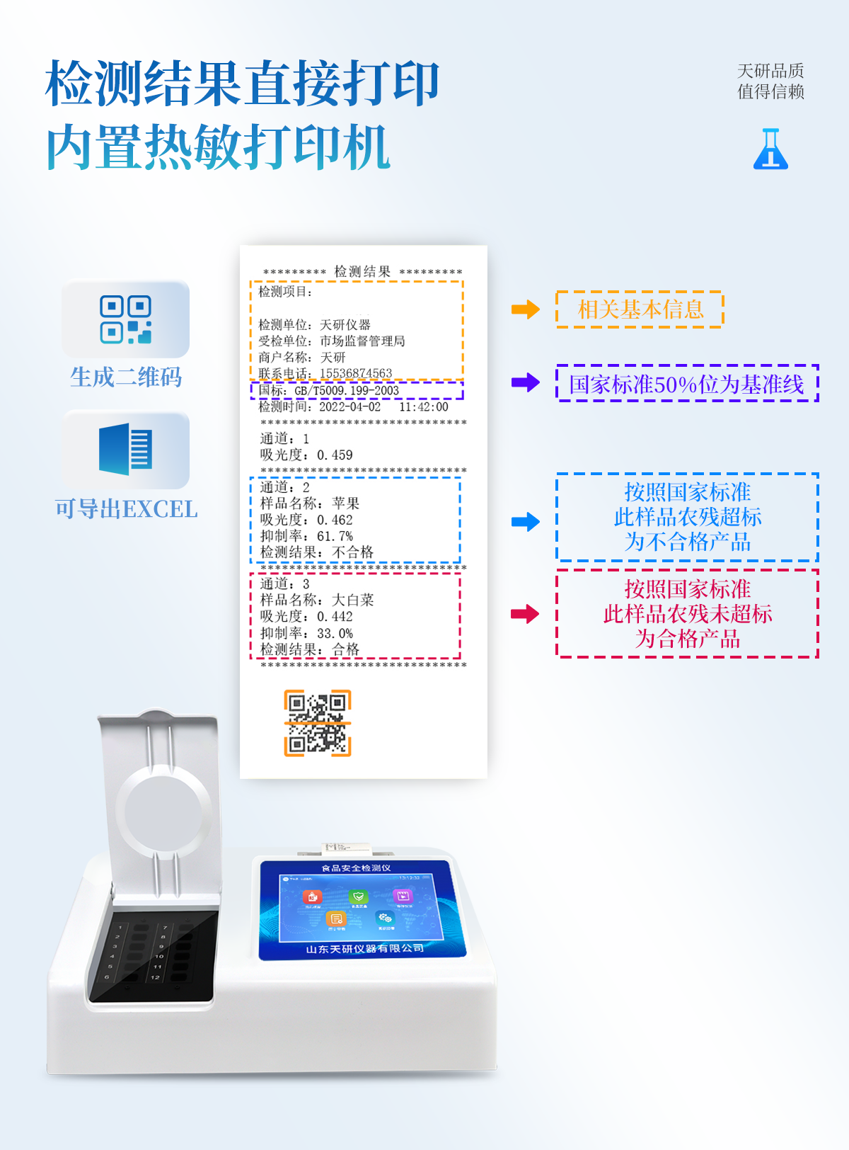 | 安卓智能操作系統(tǒng),采用更加**和人性化操作,儀器具有網(wǎng)線連接、wifi聯(lián)網(wǎng)上傳、GPRS無線遠(yuǎn)傳功能,快速上傳數(shù)據(jù)。 | 智能化程度高,儀器具有自檢功能:具有開機自檢和調(diào)零功能,具有自動檢測重復(fù)性功能。 | 檢測通道:≥12個檢測通道,可以同時測試多個樣品,每個樣品由程序控制分別獨立工作,不會互相干擾。 | 顯示方式:≥8英寸液晶觸摸屏顯示,人性化中文操作界面,讀數(shù)直觀、簡單。 | 配備新一代嵌入式熱敏打印機,可選擇手動打印或者自動打印,檢測完成可自動打印檢測報告和二維碼。 | 光源采用進(jìn)口超高亮發(fā)光二極管,高精度、穩(wěn)定性強、光源可控、可以關(guān)掉不使用的光源,功耗更低。 | 采用USB2.0接口設(shè)計,方便數(shù)據(jù)的存貯和移動,并可隨時與計算機直接相連,并且可用計算機控制儀器。實現(xiàn)數(shù)據(jù)查詢、瀏覽、分析、統(tǒng)計、打印等。 | 儀器帶有監(jiān)管平臺。數(shù)據(jù)可局域網(wǎng)和互聯(lián)網(wǎng)數(shù)據(jù)上傳,檢測結(jié)果直接傳至食品安全監(jiān)管平臺。進(jìn)行區(qū)域食品安全監(jiān)管及大數(shù)據(jù)分析處理,檢測區(qū)域食品安全長短期動態(tài),達(dá)到食品安全問題預(yù)估、預(yù)警 | 一體化便攜式快檢設(shè)備,滿足現(xiàn)場及流動檢測使用需求,能夠在同一軟件下實現(xiàn)所有檢測項目的檢測,并可通過同一窗口直觀顯示檢測結(jié)果。 | 儀器具有多品類多種類樣品菜單庫,可靈活選擇檢測樣品,不同的檢測通道可同時檢測不同的樣品項目。也可在儀器上直接編輯錄入樣品名稱、檢測指標(biāo)、送檢單位等信息并保存進(jìn)樣品數(shù)據(jù)庫。 | 樣品處理簡單省力,整體操作快速、安全、便捷。 | 儀器具有自身保護(hù)功能,可設(shè)置用戶名及密碼,防止非工作人員操作等。 | 高靈敏度,高檢測精度,高重復(fù)性精度,掃描式高精度光學(xué)傳感器。 | 儀器具有重新校準(zhǔn)、鎖定、恢復(fù)出廠設(shè)置功能。 | 支持U盤存儲。 結(jié)果判定線可修改,對照值標(biāo)定值可保存,斷電不丟失數(shù)據(jù)。 |
