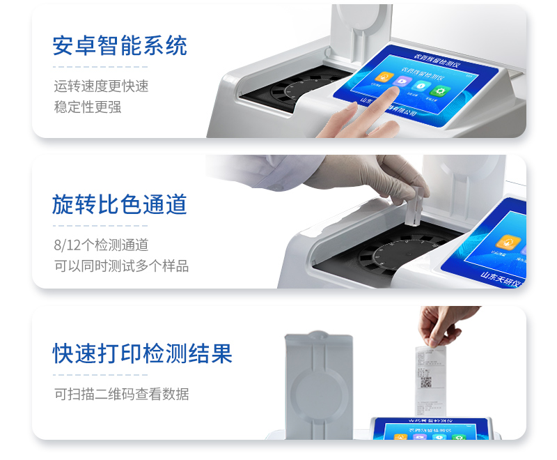 | 安卓智能操作系統(tǒng),采用更加**和人性化操作,儀器具有無線聯(lián)網(wǎng)上傳功能,快速上傳數(shù)據(jù),進行數(shù)據(jù)統(tǒng)計和分析。 | 智能化程度高,儀器具有自檢功能:具有開機自檢和調(diào)零功能,具有自動檢測重復(fù)性功能;同時,檢測完成可自動打印檢測報告和二維碼。手機掃碼可顯示出詳細(xì)檢測信息。 | 儀器帶有監(jiān)管平臺,數(shù)據(jù)可局域網(wǎng)和互聯(lián)網(wǎng)數(shù)據(jù)上傳,檢測結(jié)果直接傳至食品安全監(jiān)管平臺。進行區(qū)域食品安全監(jiān)管及大數(shù)據(jù)分析處理與數(shù)據(jù)統(tǒng)計,檢測區(qū)域食品安全長短期動態(tài),達到食品安全問題預(yù)估、預(yù)警 。 | 樣品處理簡單省力,整體操作快速、安全、便捷。 | 儀器具有自身保護功能,可設(shè)置用戶名及密碼,防止非工作人員操作等。 | 內(nèi)置強大的數(shù)據(jù)庫,可在儀器上直接選擇樣品名稱、檢測指標(biāo)、送檢單位等信息,也可在儀器上直接編輯錄入樣品名稱、檢測指標(biāo)、送檢單位等信息并保存進樣品數(shù)據(jù)庫,方便后期操作調(diào)取使用。 | 儀器具有重新校準(zhǔn)、鎖定、恢復(fù)出廠設(shè)置功能。 |