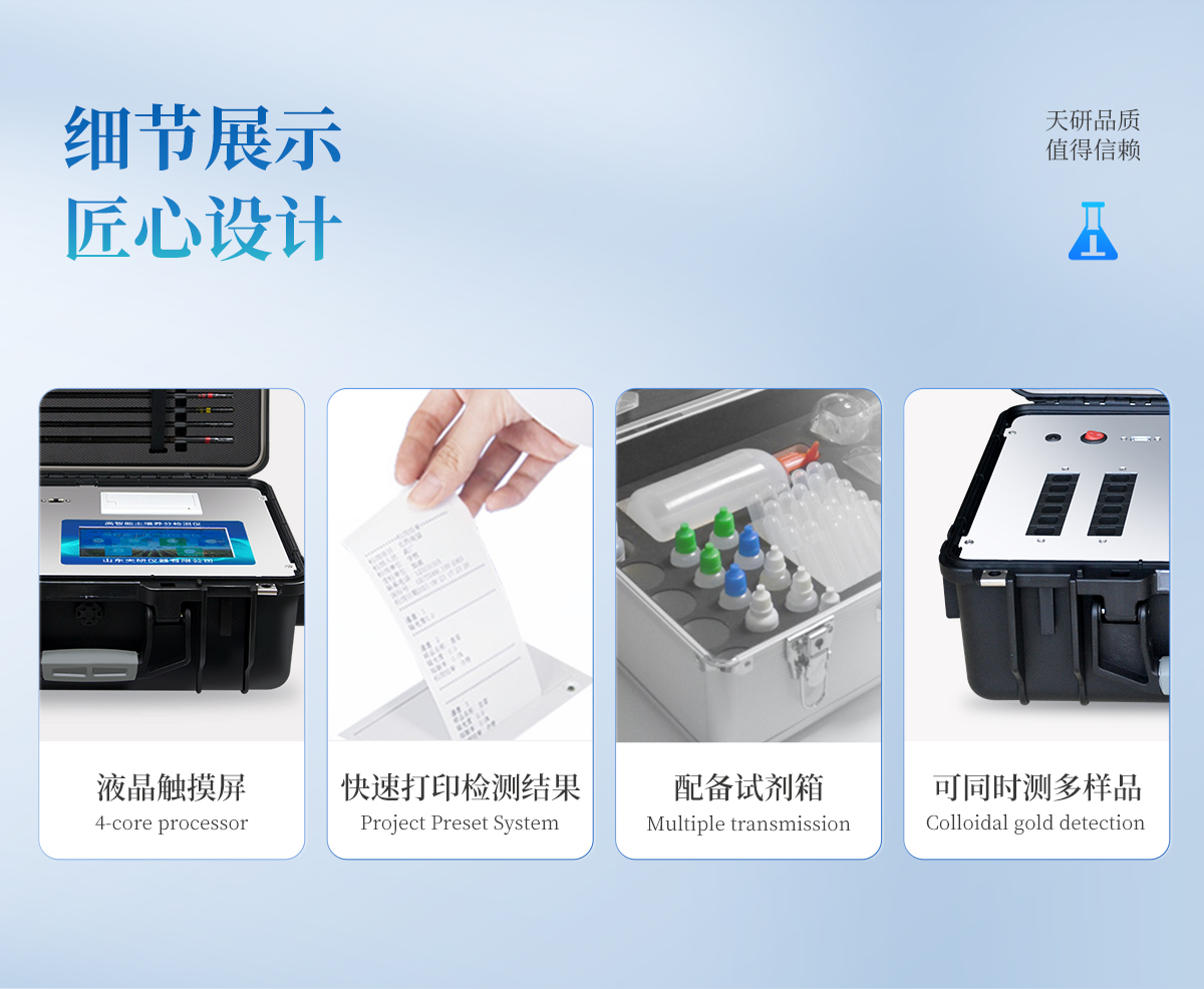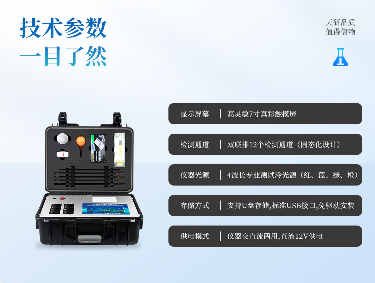 | 1、本儀器集各功能于一身,無需用戶自配附件,可靈活流動(dòng)檢測(cè)。 | 2、安卓(Android)智能操作系統(tǒng),主控芯片采用ARM Cortex-A7,RK3288/4核處理器,主頻1.88Ghz,運(yùn)轉(zhuǎn)速度更快速,穩(wěn)定性更強(qiáng)。 | 3、雙聯(lián)排12個(gè)檢測(cè)通道(固態(tài)化設(shè)計(jì)),一次性可快速檢測(cè)12個(gè)樣品,極大提升檢測(cè)效率,降低檢測(cè)成本。 | 4、檢測(cè)過程中內(nèi)置校準(zhǔn)功能,智能恒流穩(wěn)壓,光強(qiáng)自動(dòng)校準(zhǔn),確保檢測(cè)準(zhǔn)確度。 | 5、內(nèi)置作物專家施肥系統(tǒng),可對(duì)百余種全國(guó)農(nóng)業(yè)經(jīng)濟(jì)作物、果樹等的目標(biāo)產(chǎn)量計(jì)算推薦施肥量,依據(jù)施肥配方科學(xué)指導(dǎo)農(nóng)業(yè)生產(chǎn)。測(cè)土配方施肥結(jié)果可打印,打印內(nèi)容包含:作物種類、肥料種類、目標(biāo)產(chǎn)量、需求總量、建議施肥方案。 | 6、儀器標(biāo)配wifi無線上傳、4G聯(lián)網(wǎng)傳輸、GPRS無線遠(yuǎn)傳功能,快速上傳數(shù)據(jù)。 | 7、儀器內(nèi)置大容量?jī)?nèi)存,支持查看全部歷史檢測(cè)記錄,以及傳輸所有檢測(cè)數(shù)據(jù)。 | 8、配有智慧云農(nóng)業(yè)平臺(tái),儀器連入無線網(wǎng)絡(luò)后,可將檢測(cè)數(shù)據(jù)可選擇性或批量無線上傳,方便用戶進(jìn)行長(zhǎng)期數(shù)據(jù)管理和可視化分析。 | 9、儀器配同時(shí)具有USB接口、以太網(wǎng)接口,并可隨時(shí)用U盤拷貝出數(shù)據(jù)。 | 10、可用手機(jī)隨時(shí)登錄云平臺(tái)在線移動(dòng)查看歷史數(shù)據(jù) | 11、內(nèi)置植物營(yíng)養(yǎng)診斷標(biāo)準(zhǔn)圖譜,根據(jù)各農(nóng)作物營(yíng)養(yǎng)缺失的圖片,進(jìn)行葉面對(duì)比,診斷豐缺。 | 12、4波長(zhǎng)專業(yè)測(cè)試?yán)涔庠矗t、藍(lán)、綠、橙),光源波長(zhǎng)穩(wěn)定,長(zhǎng)時(shí)間連續(xù)工作光源無溫漂現(xiàn)象,壽命長(zhǎng)達(dá)10萬小時(shí)級(jí)別,重現(xiàn)性好,準(zhǔn)確度高。 | 13、比色池部分采用標(biāo)準(zhǔn)1cm比色皿,無機(jī)械位移及磨損,光路測(cè)試定位**,有效屏蔽外光干擾,保證檢測(cè)結(jié)果優(yōu)于國(guó)標(biāo)要求。 | 14、儀器系統(tǒng)內(nèi)帶有樣品前處理操作視頻,各種樣品檢測(cè)方法點(diǎn)擊視頻模塊即可觀看,檢測(cè)人員無需自學(xué)說明書,指導(dǎo)教學(xué)方便快速,方便新手快速操作。 | 15、內(nèi)置新一代高速熱敏打印機(jī)(無需色帶),打印內(nèi)容包含:檢測(cè)單位、檢測(cè)人員、檢測(cè)項(xiàng)目、通道號(hào)、吸光度、養(yǎng)分含量(mg/kg)、檢測(cè)時(shí)間、以及二維碼等信息 | 16、高靈敏7寸真彩觸摸屏,采用更加**和人性化操作,高清晰高交互顯示,大程度降低傳統(tǒng)儀器的繁瑣操作和失誤。 | 17、內(nèi)置時(shí)鐘功能,方便操作時(shí)間記錄,長(zhǎng)期歷史追溯。 | 18、可設(shè)置多賬戶賬號(hào)密碼登錄,**UI交互界面,不同的用戶可自由添加編輯檢測(cè)信息,保存后可長(zhǎng)期使用。 | 19、GPS功能:可在野外作業(yè)時(shí)記錄經(jīng)緯度地點(diǎn),滿足特殊用戶需求。 | 20、內(nèi)置低電壓提示功能,可在檢測(cè)時(shí)明確電量,避免測(cè)試數(shù)據(jù)偏移,同時(shí)具有斷電保護(hù)功能,斷電自動(dòng)保存數(shù)據(jù),防止數(shù)據(jù)丟失。 | 21、交直流兩用供電方式,內(nèi)置大容量充電鋰電池,滿電狀態(tài)下可連續(xù)工作10余小時(shí),同時(shí)可外接車載電源蓄電。 | 22、儀器具有中英文切換功能,可滿足出口要求。 | 23、高強(qiáng)度PVC工程塑料手提箱設(shè)計(jì),堅(jiān)固耐用,便于攜帶。 |
