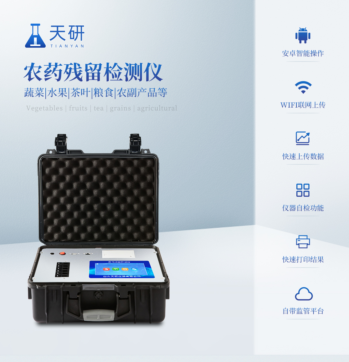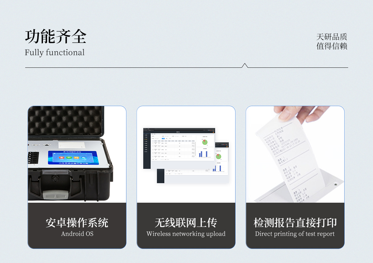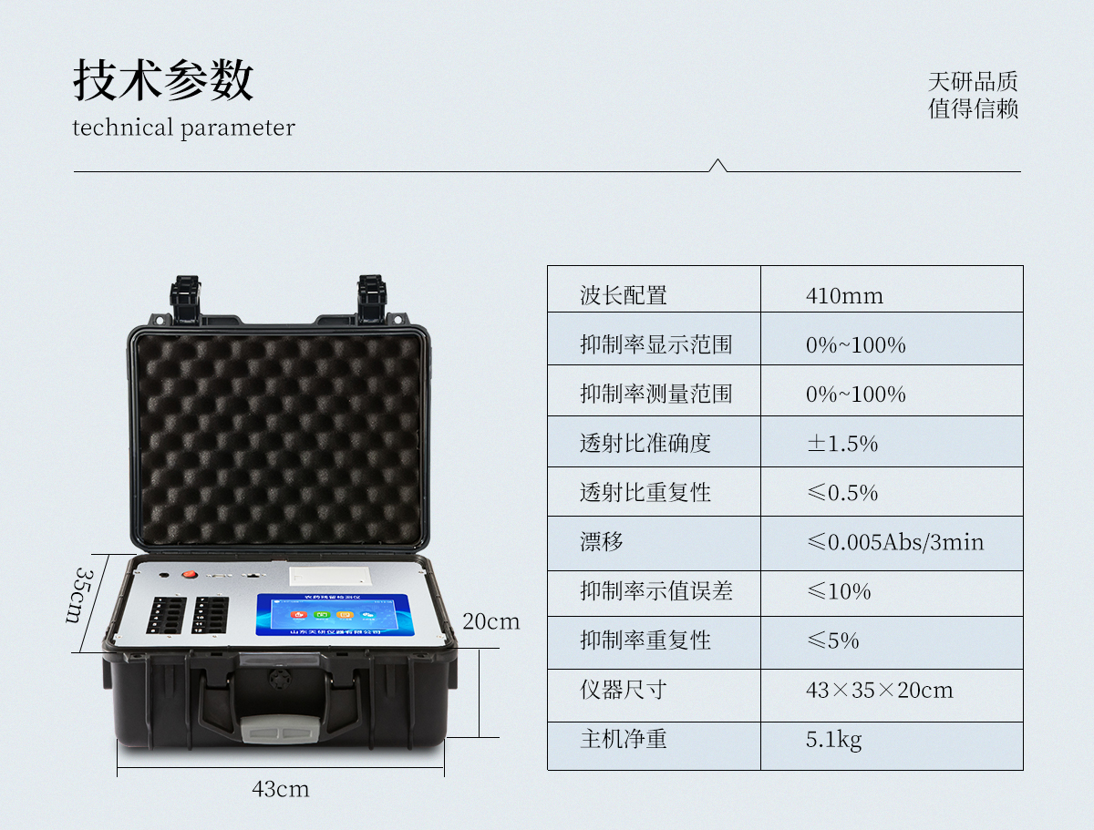 | 機箱采用工業(yè)級ABS工程塑料箱,方便攜帶,穩(wěn)固耐用,便于流動測試。 | 智能操作系統(tǒng),采用更加人性化操作,主控采用多核處理器,主頻1.88Ghz,運轉(zhuǎn)速度更快速,穩(wěn)定性更強。 | 自動判斷樣品是否合格,檢測結(jié)果更加直觀。 | 儀器具有100多種蔬菜名稱菜單庫,分類管理,并可按需添加或刪除蔬菜名,編輯蔬菜名稱,可直接打印出蔬菜名稱。 | 檢測通道:12個檢測通道,可以同時測試多個樣品,循環(huán)檢測,即放即檢,每個樣品由程序控制分別獨立工作,不會互相干擾。 | 儀器具有wifi聯(lián)網(wǎng)功能,可將數(shù)據(jù)快速上傳電腦,進行數(shù)據(jù)管理與統(tǒng)計,4G信號GPRS遠傳功能,可插手機卡實現(xiàn)數(shù)據(jù)遠傳平臺,。 | 顯示方式:7英寸高靈敏真彩觸摸屏顯示,人性化中文操作界面,讀數(shù)直觀、簡單。 | 打印機采用串口5v打印,可選擇手動打印或者自動打印,三分鐘出打印結(jié)果,打印格式為檢測人姓名、吸光度差值、檢測時間、檢測機構(gòu)、樣品名稱及結(jié)果判定。 | 光源采用進口超高亮發(fā)光二極管,具有低功耗、高精度、穩(wěn)定性強、光源可控可以關(guān)掉不使用的光源,響應(yīng)速度快等優(yōu)點。 | 智能恒流穩(wěn)壓,光強自動校準(zhǔn),長時間連續(xù)工作光源無溫漂現(xiàn)象。 | 采用USB2.0接口設(shè)計,方便數(shù)據(jù)的存貯和移動,并可隨時與計算機直接相連,并且可用計算機控制儀器。實現(xiàn)數(shù)據(jù)查詢、瀏覽、分析、統(tǒng)計、打印等。 | 智能化程度高,儀器具有自檢功能:具有開機自檢和調(diào)零功能,具有自動檢測重復(fù)性功能 | 儀器具有自身保護功能,可設(shè)置用戶名及密碼,防止非工作人員操作等。 | 采用DC12v直流供電,安全系統(tǒng)更高,并且配備6A鋰電池充電器。 | 儀器具有重新校準(zhǔn)、鎖定、恢復(fù)出廠設(shè)置功能。 |