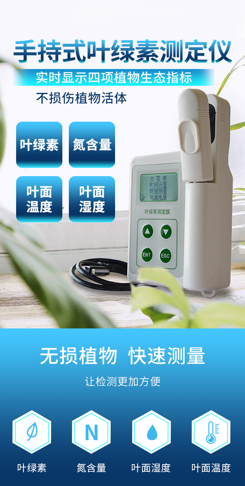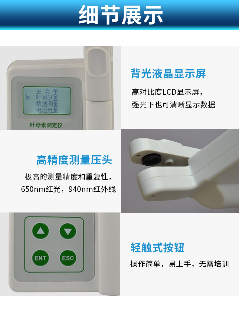 | 數(shù)據(jù)測(cè)量:**的測(cè)量精度和重復(fù)性(精度:± 1.0 SPAD,重復(fù)性:±0.3 SPAD) ,媲美進(jìn)口品牌,或可根據(jù)已知葉綠素含量的葉片或標(biāo)準(zhǔn)試樣客戶自行校準(zhǔn) | 數(shù)據(jù)分組:儀器可將數(shù)據(jù)自動(dòng)分組,并可自動(dòng)計(jì)算每組數(shù)據(jù)的平均值。可將同一葉片測(cè)量的數(shù)據(jù)自動(dòng)分為一組,便于查看每次測(cè)量數(shù)據(jù)及這一組數(shù)據(jù)的平均值,有效的避免了不同葉片的測(cè)量數(shù)據(jù)混淆。采用16GB超大存儲(chǔ),所以分組數(shù)量和每組的數(shù)據(jù)不受限制 | 數(shù)據(jù)存儲(chǔ): 16GB超大存儲(chǔ)空間,數(shù)據(jù)存儲(chǔ)量巨大 | 數(shù)據(jù)瀏覽:可在儀器上隨時(shí)瀏覽測(cè)量的數(shù)據(jù)、每組數(shù)據(jù)的平均值和刪除異常數(shù)值。數(shù)據(jù)情況更加直觀 | 數(shù)據(jù)導(dǎo)出:多功能USB接口,可實(shí)現(xiàn)數(shù)據(jù)導(dǎo)出與充電功能,可將儀器與電腦直接聯(lián)機(jī),數(shù)據(jù)以EXCEL格式導(dǎo)出,無需上位機(jī)軟件,操作簡(jiǎn)單方便 | 顯示:高對(duì)比度LCD顯示屏,強(qiáng)光下也可清晰顯示數(shù)據(jù) | 測(cè)量迅速、簡(jiǎn)便:測(cè)量時(shí)只需要將葉片插入并合上測(cè)量探頭即可,不需要采摘葉片,不影響作物正常生長(zhǎng),可以在作物的生長(zhǎng)過程中全程對(duì)特定的葉片進(jìn)行監(jiān)測(cè),從而得到更科學(xué)的分析結(jié)果 | 電池消耗:低功耗模式設(shè)計(jì),內(nèi)置大容量鋰離子充電電池,節(jié)能環(huán)保并方便進(jìn)行戶外操作 | 儀器充電:**的充電管理設(shè)計(jì),可適配多數(shù)的USB口(5V)充電器,具有防過充功能 | 易攜帶:250g的重量,方便攜帶到田間進(jìn)行活體測(cè)量 |