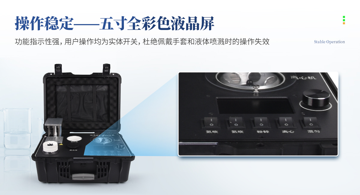 | 1、功能緊湊,集成四種樣品前處理常用的功能,完成樣品一站式處理。 | 2、結(jié)構(gòu)穩(wěn)固,機箱采用***工程塑料,具備**的抗沖擊性、耐腐蝕性、便攜性。 | 3、操作穩(wěn)定,機器采用五寸全彩色液晶屏,功能指示性強,用戶操作均為實體開關(guān),杜絕佩戴手套和液體噴濺時的操作失效。 |