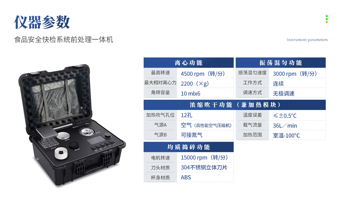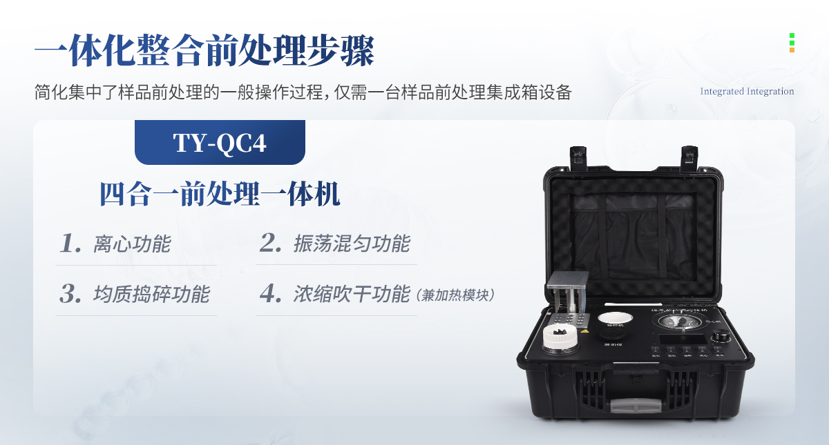 QC4型四合一樣品檢測前處理一體機(箱)是集吹干、離心、均質(zhì)、混勻功能的一體化整合,極大的簡化和集中樣品前處理的一般操作過程,結(jié)合移動便攜的工程塑料箱體,特別適合農(nóng)獸藥殘留畜禽水產(chǎn)品質(zhì)量安全現(xiàn)場快速檢測。