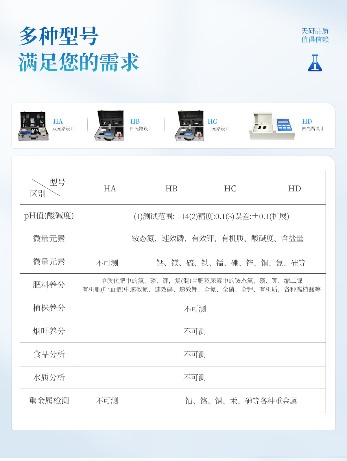 | 測試一個復合肥料樣(N、P、K)≤50分鐘; 每增加一個肥料樣品時間增加20分鐘。 | 測試一個有機肥料樣(N、P、K、有機質) ≤1.5小時;每增加一個樣品加時30分鐘。 |