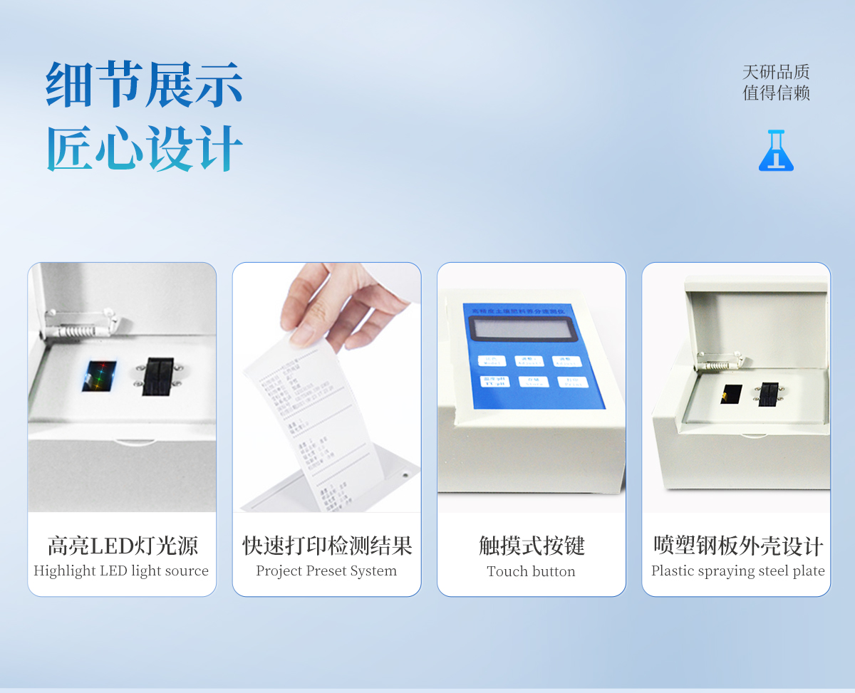 | 升級款,噴塑鋼板外殼設計,堅固耐用,配套成套附件及成品藥劑。 | 微電腦控制,數字化線路、程序化設計,液晶顯示,交直流兩用,可野外流動測試。 | 分辨率:0.001,觸摸式按鍵,內置新一代熱敏打印機,可打印測試結果。 | 肥料養(yǎng)分專用檢測儀可檢測化肥、有機肥(含葉面肥、水溶肥、噴施肥等)中的速效氮、速效磷、有效鉀、全氮、全磷、全鉀、有機質、酸堿度,鈣、鎂、硫、鐵、錳、硼、鋅、銅、氯、硅等各種中微量元素以及鉛、鉻、鎘、汞、砷等各種重金屬含量。 | 采用高亮LED燈光源、雙撥輪濾光式處理技術,保證光源波長穩(wěn)定, 硅半導體作為信號接收系統(tǒng),壽命長達10萬小時級別。光源穩(wěn)定,重現(xiàn)性好,準確度高。 | 比色槽部分采用單通道設計,無機械位移及磨損,光路測試定位**,保證測定結果精度。 | 采用自主分析方法(號:ZL 2018 2 1777724.7),保證檢測結果絕對達到國標要求。 | 內置熱敏打印機,肥料打印結果為百分含量,測試誤差小于0.5%。 |