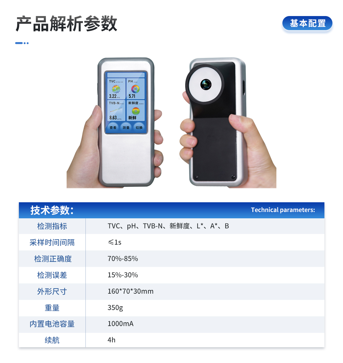 | 1. ※檢測指標(biāo):TVC、pH、TVB-N、新鮮度、L*、A*、B | 2. 采樣時(shí)間間隔:≤1s | 3. 檢測正確度:70%-85% | 4. 檢測誤差:15%-30% | 10. 外形尺寸:160*70*30mm | 11. 重量:350g | 12. 內(nèi)置電池容量:1000mA | 13. 續(xù)航:4h |
