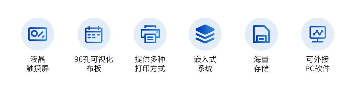 | 1. 10.4英寸彩色液晶觸摸屏輸入,大屏顯示,操作快捷。 | 2. 全屏顯示96孔可視化布板操作界面。 | 3. 自動儲存標準曲線,用戶可對標準曲線進行修正。 | 4. 內(nèi)置嵌入式系統(tǒng),無需外接電腦即可操作、存儲、打印。 | 5. 單波長和雙波長測試模式下均可進行自動調(diào)零。 | 6. 可選配外接PC軟件,網(wǎng)絡化支持,迎合數(shù)字化發(fā)展方向,可定制上傳。 | 7. 海量存在,至少可儲存100萬板(96)測試數(shù)據(jù)及500個編程項目,并支持數(shù)據(jù)備份恢復合并。 | 8. 在同一板上可進行24個不同項目并可用顯示區(qū)分的測試,并可同一板檢測定性和定量項目。 | 9. 模板功能,固定檢測工作,極大簡化操作人員工作量。 | 10. 智能計算測試結果,確保測試結果的準確有效,并可自動報警。 | 11.全新Windows彩色圖形化界面,全中文操作系統(tǒng),支持鼠標、鍵盤,支持多種輸入法。 | 12. 光源智能開關,延長其壽命。 | 13. 全面完善的質(zhì)控功能,包含westguard多規(guī)則質(zhì)控,即刻法質(zhì)控等多種質(zhì)控圖及質(zhì)控參數(shù)計算,具有質(zhì)控報警功能。 | 14. 提供多種打印方式及多種形式中文報告,并可定制各式報告。 | 15. 布板和保存導入功能,大幅提高常用項目的測試效率。 | 16.可選擇吸光度、Cut-Off定性計算、單點定標、折線回歸、線性回歸、指數(shù)回歸、對數(shù)回歸、雙對數(shù)回歸、log-logit、冪回歸、四參數(shù)回歸、酶抑制率等計算方法。 | 17. 專用系統(tǒng)維護菜單,自動判斷儀器當前狀態(tài)及性能指標,并可打印相關數(shù)據(jù)。 |