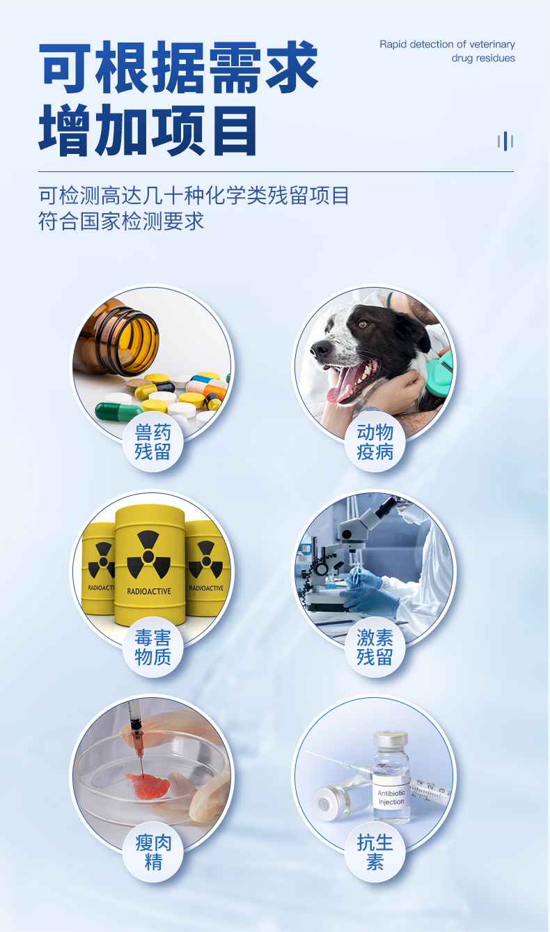 | 瘦肉精激素類(獸藥):鹽酸克倫特羅、沙丁胺醇、萊克多巴胺、己烯雌酚、喹乙醇等 | 抗生素殘留類(獸藥):四環(huán)素類、硝基呋喃類、磺胺類、沙星類、喹諾酮類、慶大霉素、鏈霉素、阿莫西林、紅霉素等 | 水產(chǎn)品安全類:孔雀石綠、氯霉素、呋喃妥因代謝、呋喃西林代謝、呋喃它酮代謝、呋喃唑酮代謝等 | 以及病害肉及肉類新鮮度的擴(kuò)展檢測(cè)。 |